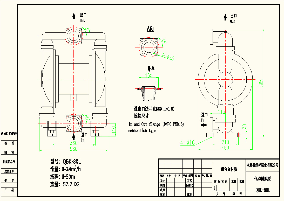 QBK-80L鋁合金氣動(dòng)隔膜泵,泵體采用優(yōu)質(zhì)鑄鐵材質(zhì),配丁腈橡膠隔膜片,適用于污水,油類等無(wú)強(qiáng)腐蝕類介質(zhì)的輸送。流量0-24m3/h,揚(yáng)程0-50m,口徑DN80,法蘭連接。